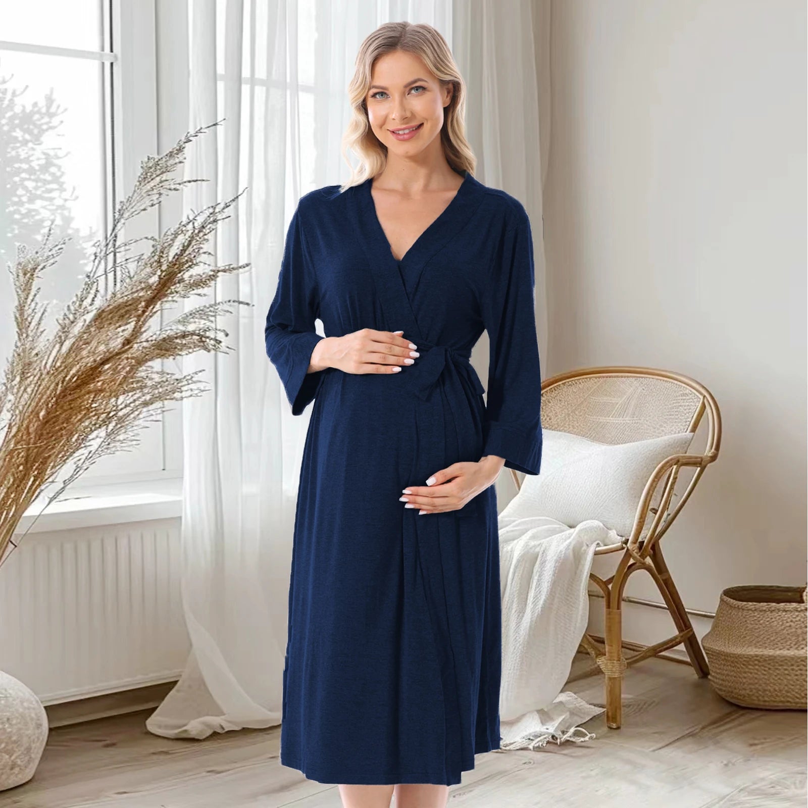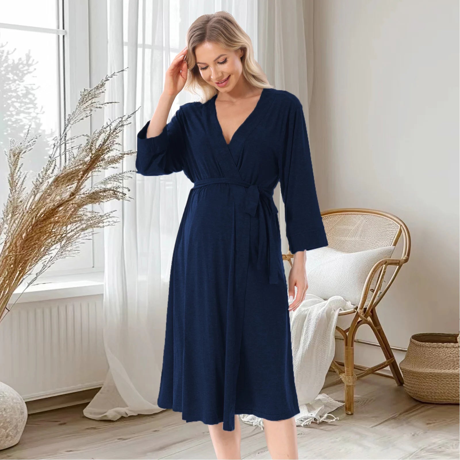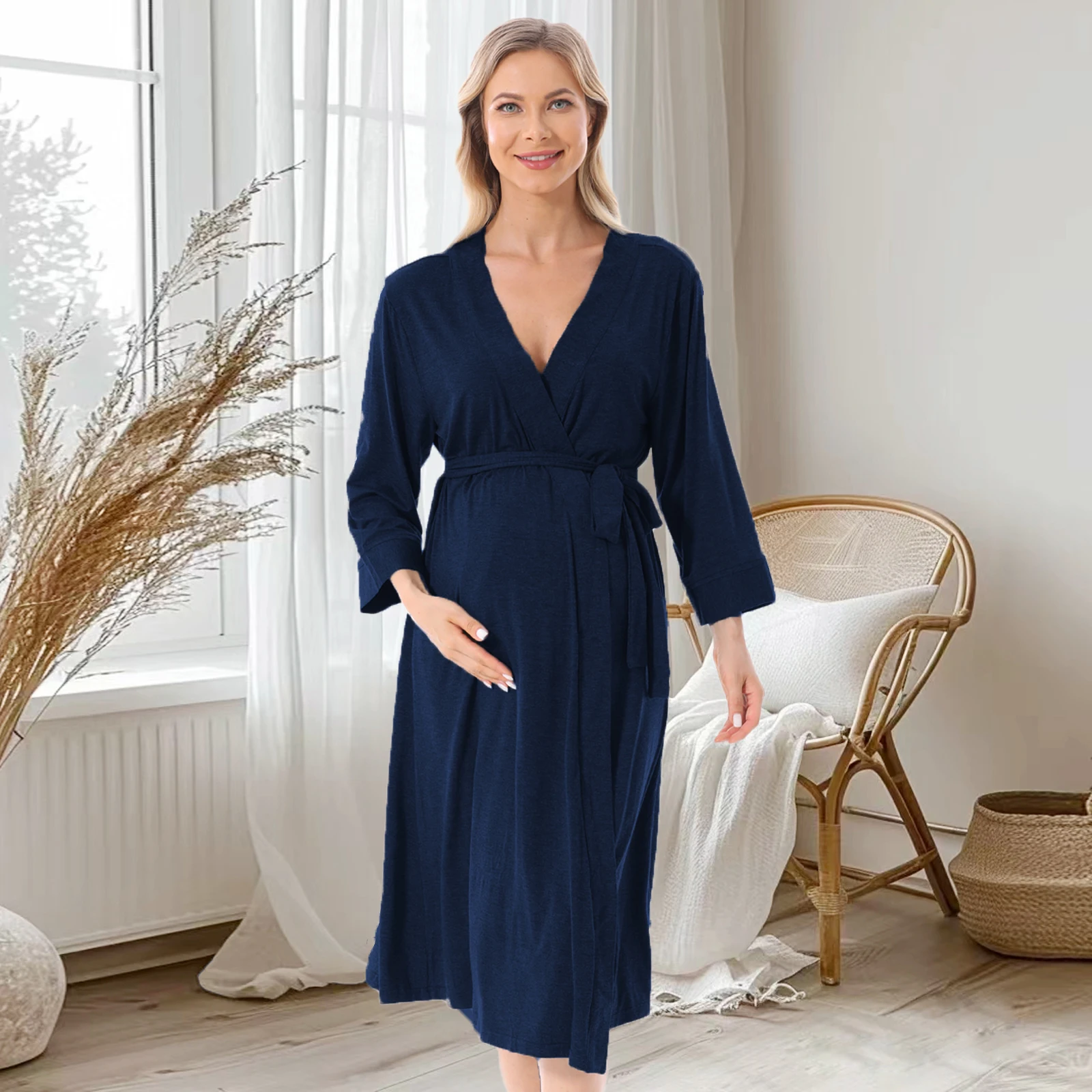 Scopri la vestaglia premaman con apertura per allattamento: tessuto morbido, scollo a V, maniche ¾, ideale per gravidanza, ospedale e post parto. Disponibile in varie taglie!
