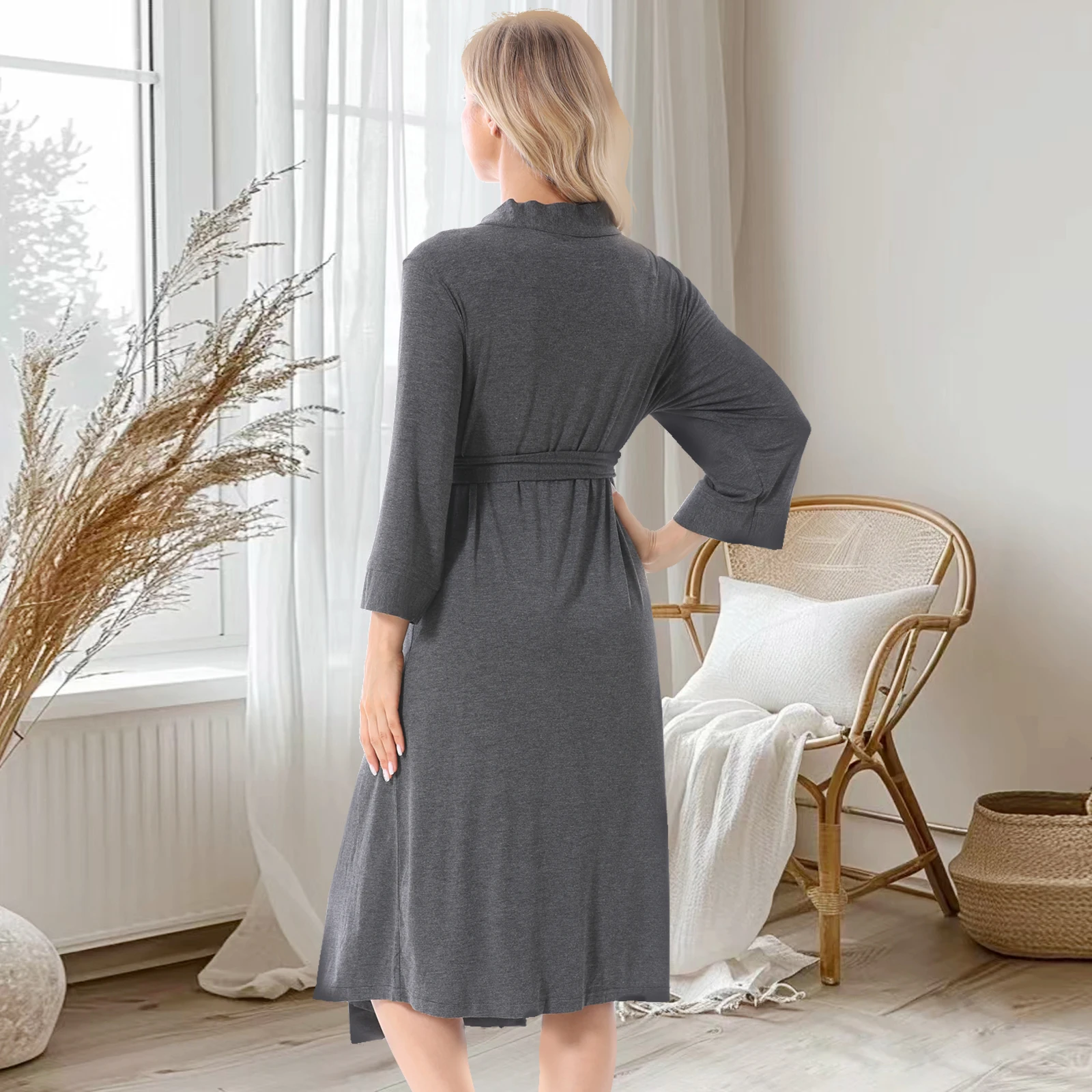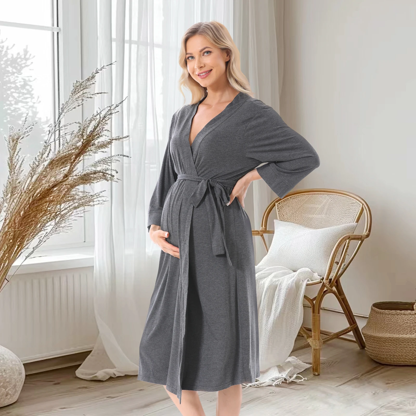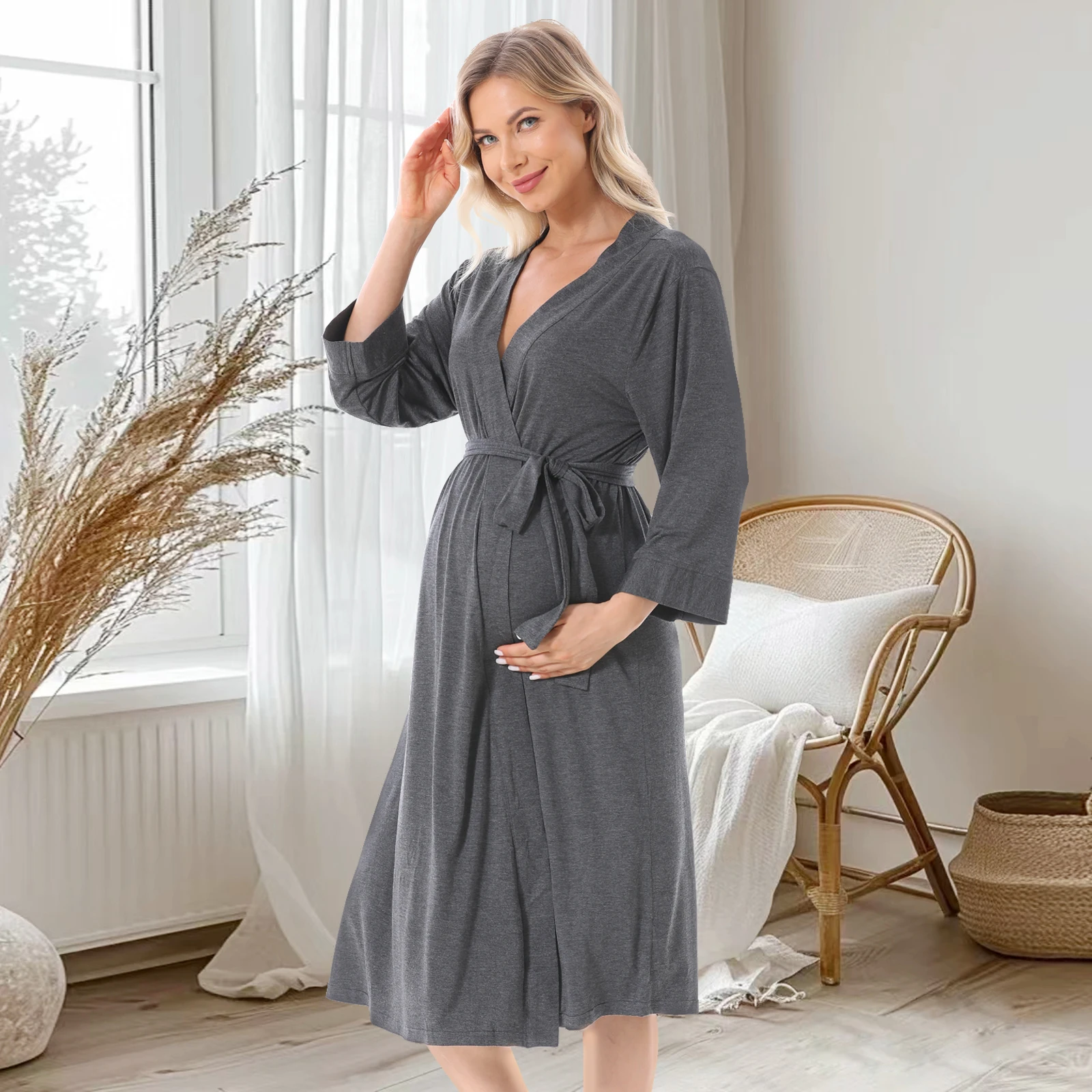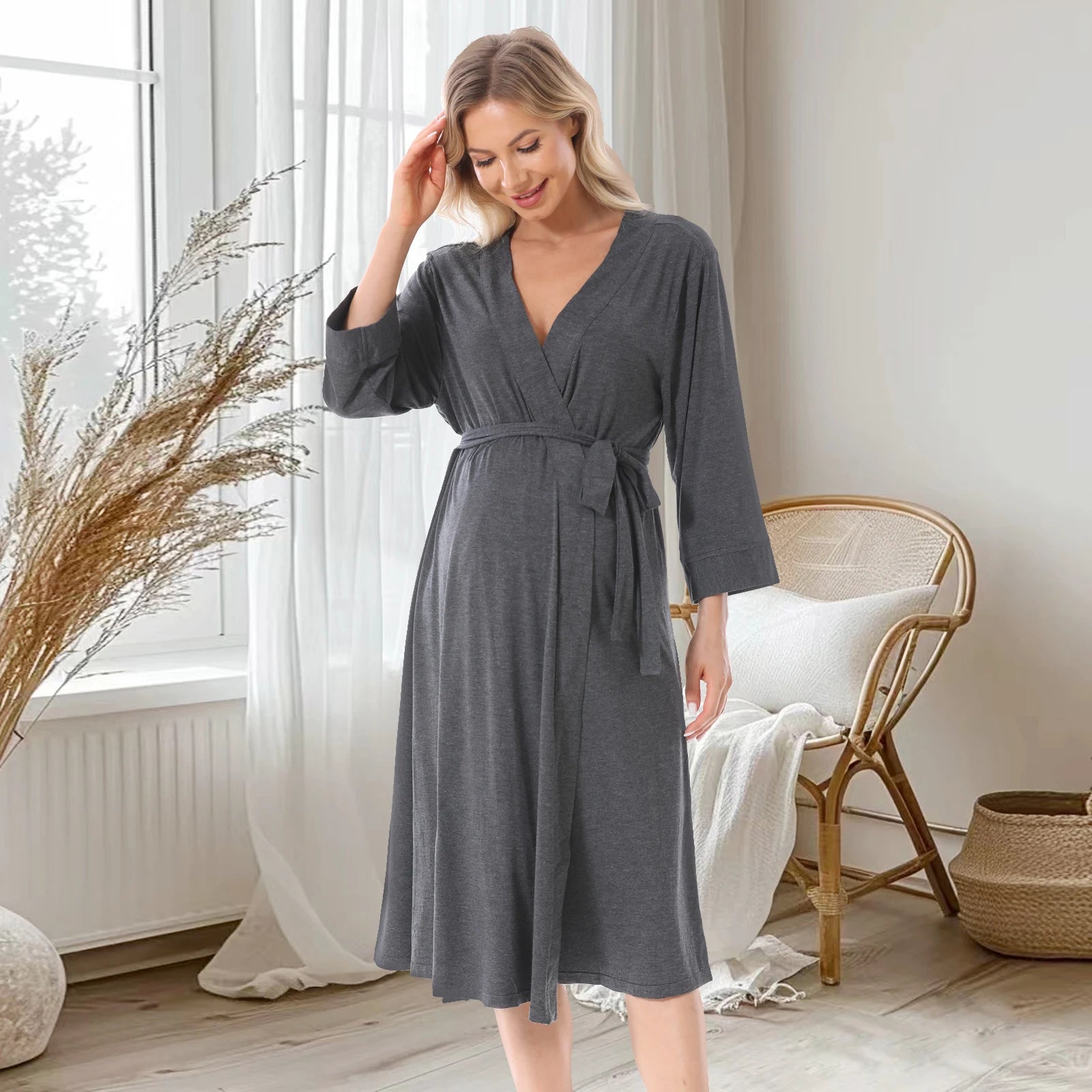Scopri la vestaglia premaman con apertura per allattamento: tessuto morbido, scollo a V, maniche ¾, ideale per gravidanza, ospedale e post parto. Disponibile in varie taglie!