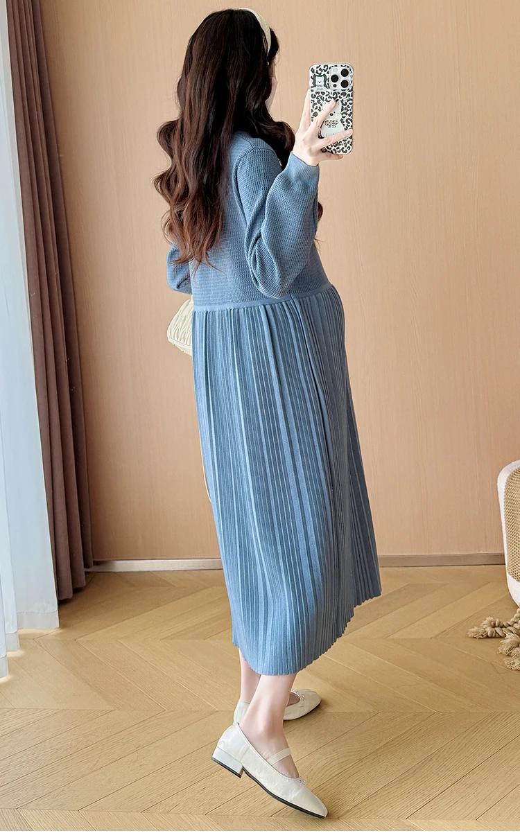 Il colletto con fiocco decorativo, le maniche lunghe e la gonna plissettata donano un tocco chic e dolcemente vintage, mentre il taglio mid-calf valorizza ogni silhouette senza rinunciare alla comodità. Ideale sia per un look quotidiano elegante che per un’occasione speciale, questo vestito premaman ti accompagna con grazia e calore.